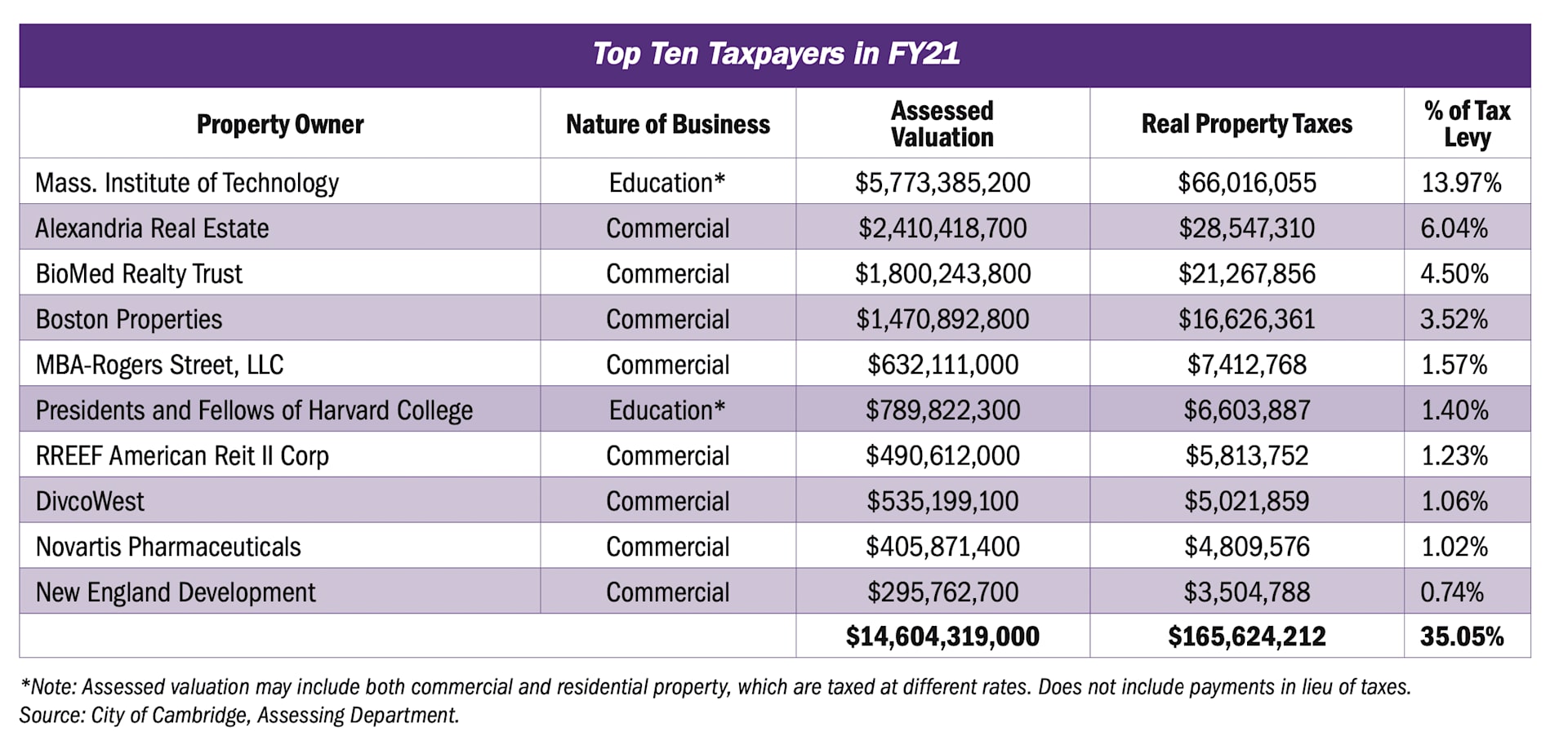 As you can see, MIT itself pays 13.97% of the entire property tax amount in a year. The top ten taxpayers cover a third of all the taxes collected. Generally, commercial taxpayers cover 2/3 of all property taxes collected in Cambridge. This is the largest reason why Cambridge can afford to charge their residential owner-occupants such a low rate.