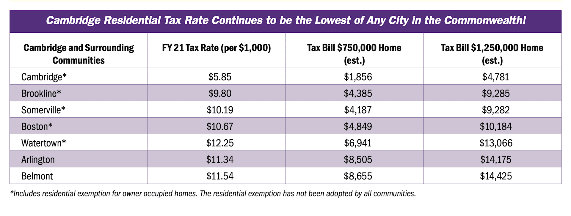 See the chart below for a comparison of property taxes between Cambridge and nearby towns: