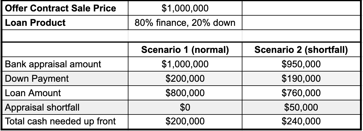 The risk here is that if you waive the appraisal section of the mortgage contingency, you could be on the hook for coming up with enough cash to cover the appraisal shortfall. In this example, it would be an extra $40,000 cash.