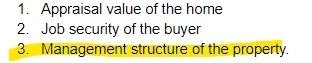 Lastly, the bank wants to make sure that nothing in the ownership structure of the property could negatively affect the value of the house, which is mostly relevant with condo associations. For example, if a condo association has poor financials or one person has too much control, this will negatively affect market value and will give a bank pause and cause it to lower their valuation or worse, not allow financing at all. The management structure of a building is generally analyzed via the condo questionnaire, which is a fairly standard list of questions produced by the lender and filled out by a trustee of the association. The lender’s attorney will also review the condo documents and financials in addition to the questionnaire to ascertain the health of the association on behalf of the lender.