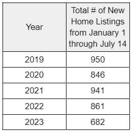 For an idea of overall annual inventory, see the following table. To make it comparable to this year’s data, I only tabulated homes listed through July 14 in any given year.