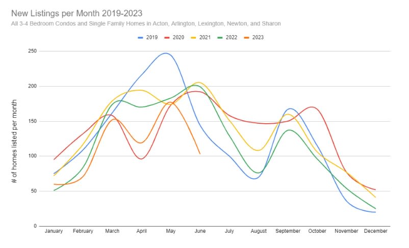 For our spring 2023 market recap, I decided to conduct an analysis on inventory. I compared new listings data across 2019 through mid-July. To get a representative sample of the most competitive markets, I picked a sampling of towns with highly rated schools and limited the properties to 3-4 bedroom condos and single family homes. The chart below shows the data of when homes were newly listed. Note that I did not include any data for properties that expired, but I did include all properties that were active and under contract today. What this means is that the actual June/July 2023 data would be even lower than shown below since it’s possible that some listings today would expire tomorrow, but I don’t believe that would affect the general trends we see.