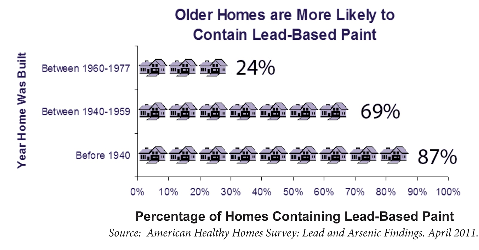 According to an American Healthy Homes Survey from April 2011, up to 87% of homes built before 1940 have lead paint. See the chart below: